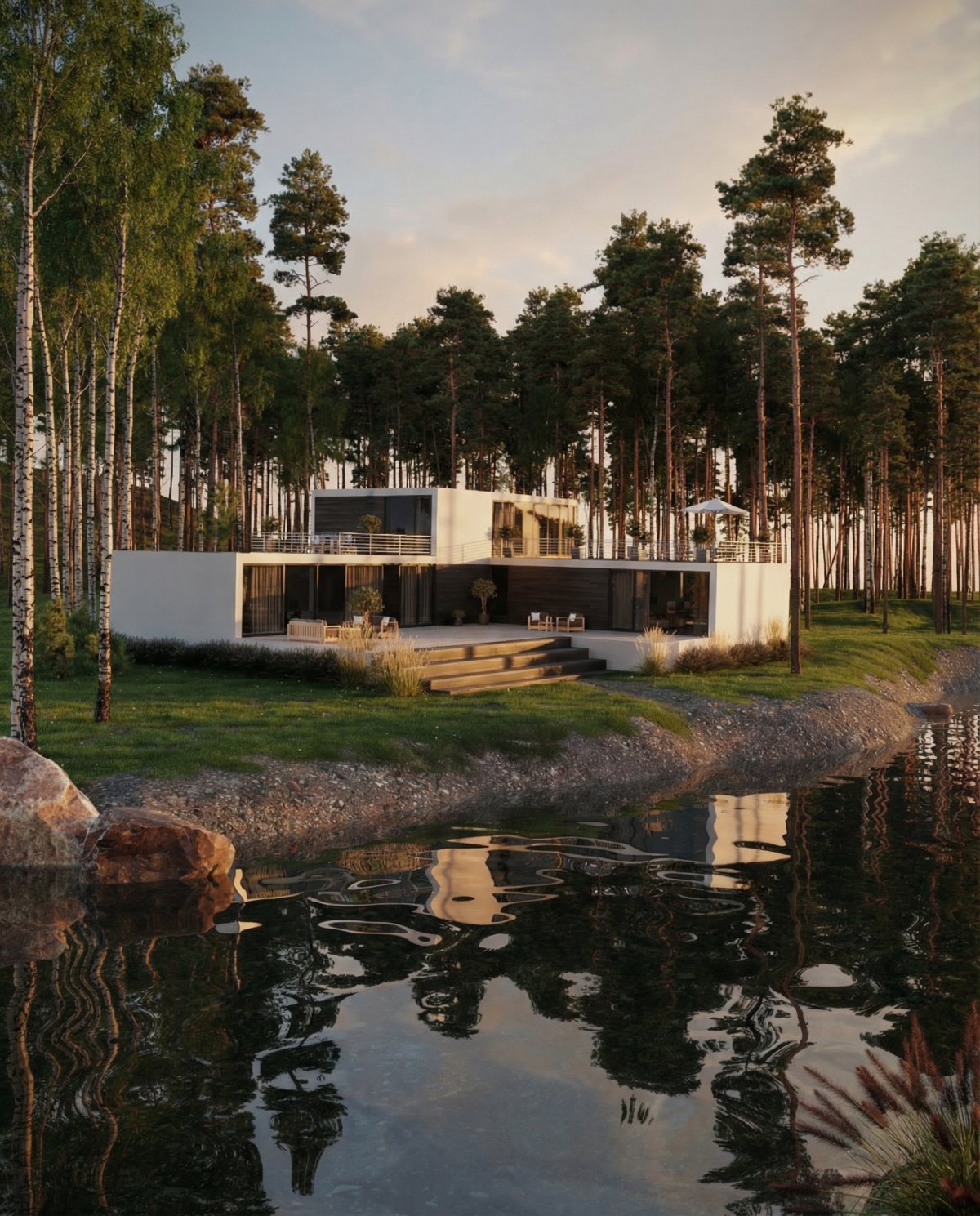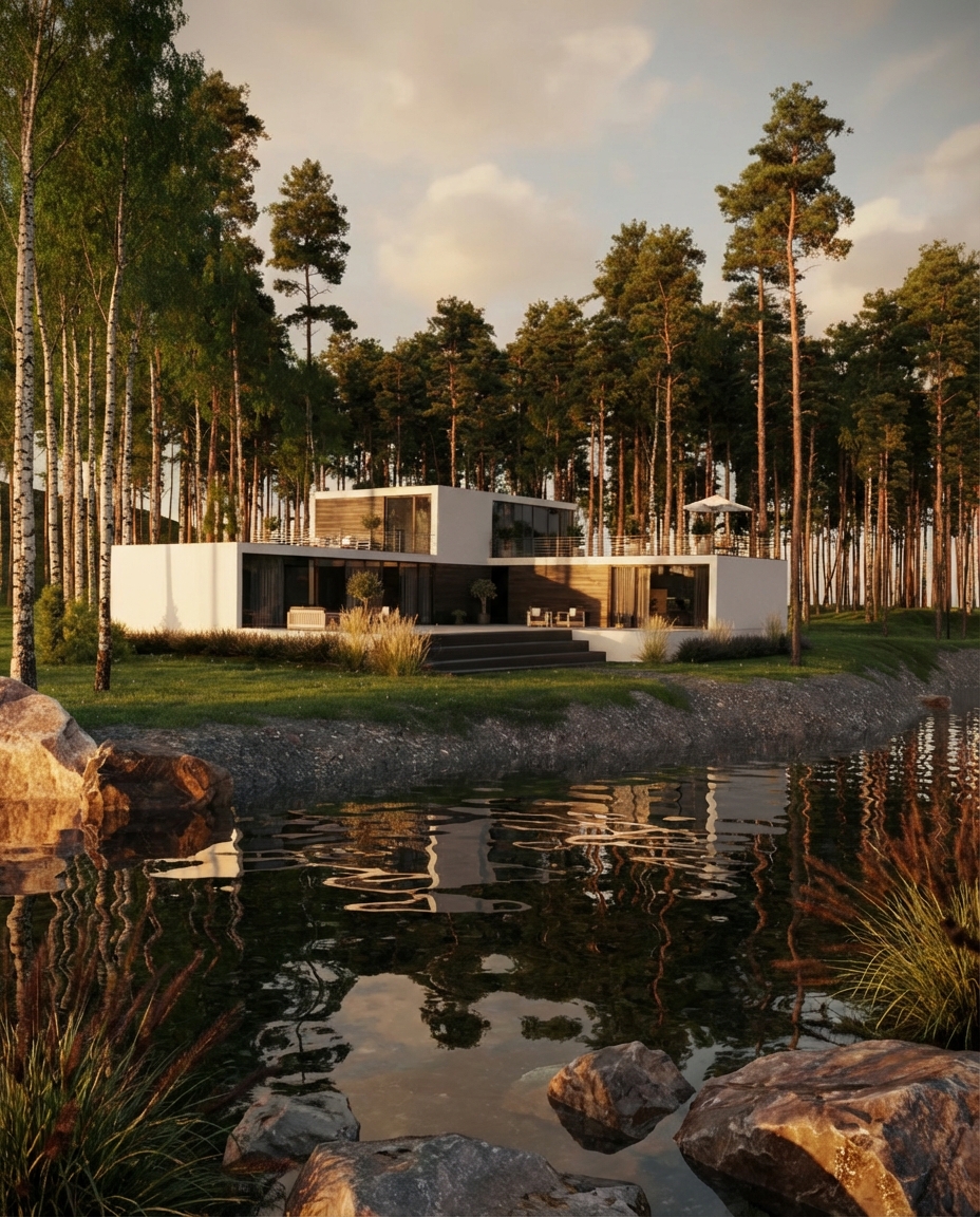 This residence demonstrates how contemporary architecture can coexist in deep harmony with a mature pine and birch forest while preserving the site's natural character. Key sustainable qualities embedded in the design: